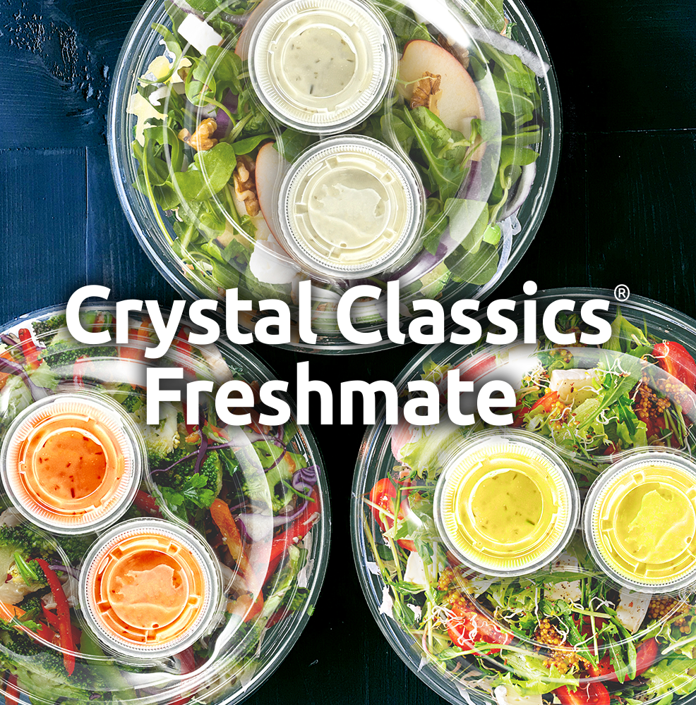Busy customers crave fresh, fast, and flavorful options. FreshMate makes it easy to stock your cold cases with eye-catching salads that deliver on all three – while delivering for your bottom line. Pair the FreshMate lid with any Crystal Classics® 8.5” base to create appealing displays that convert more customers – while holding toppings separate to extend shelf life and increase sell-through.
